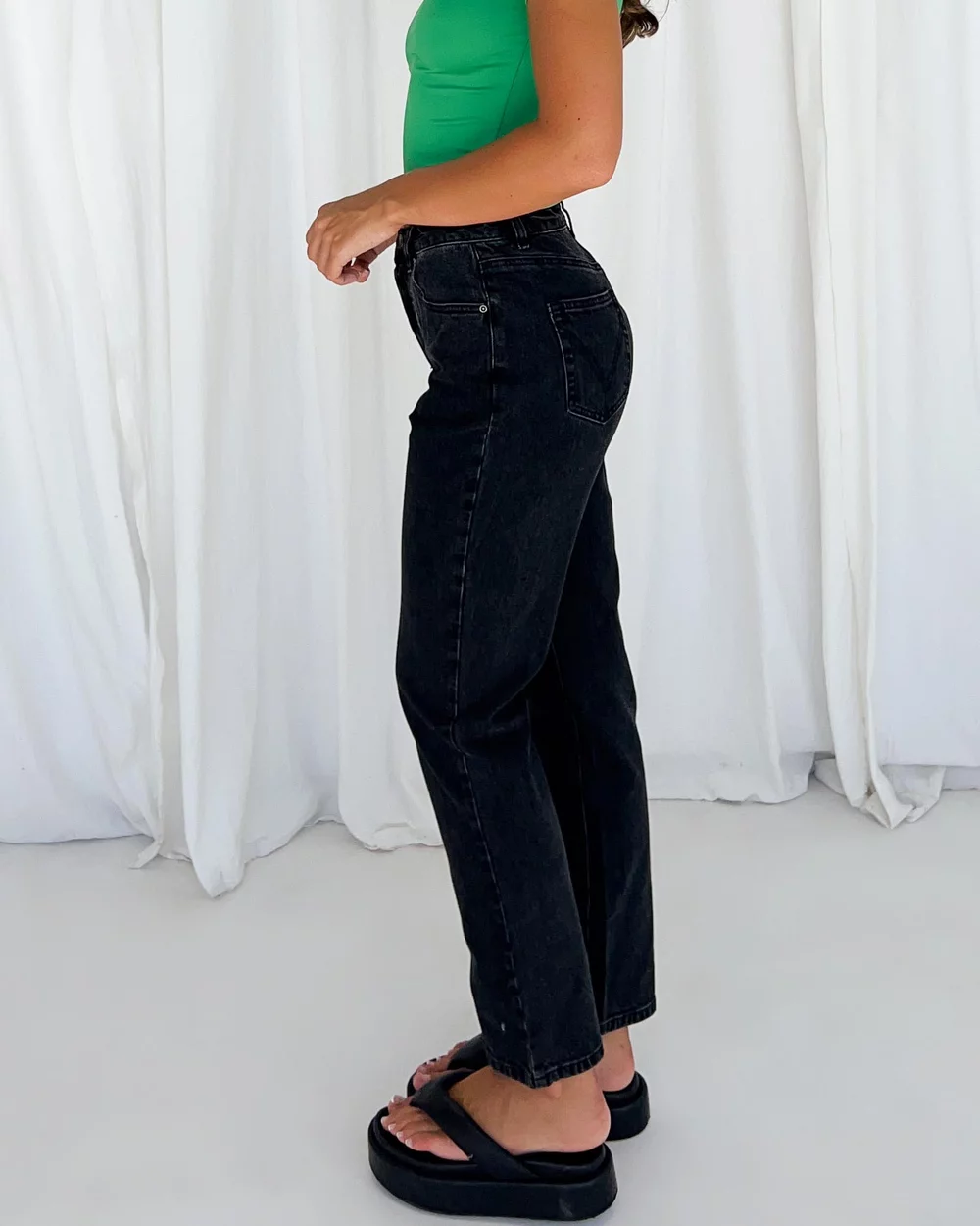 Length: 100cm; Inside Leg: 71cm; Front Rise: 30.5cm; Leg Opening: 35cm (size AU 8). Our model is 172.7cm tall and has a 78.7cm bust, 62.5cm waist and 89cm hips.